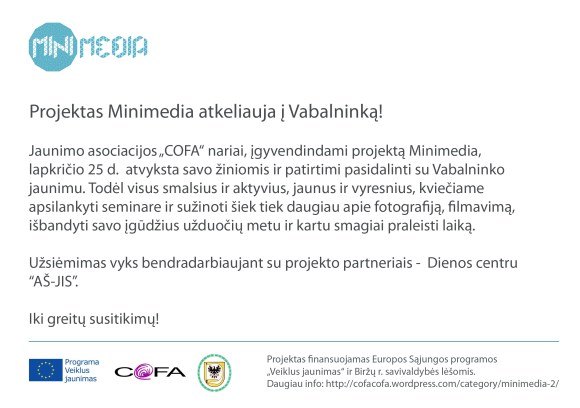 Kitas projekto Minimedia užsiėmimas vyks lapkričio 24 d. Vabalninke, bendradarbiaujant su projekto partneriais – Dienos centru “AŠ-JIS“. Labai lauksime jūsų atvykstant!